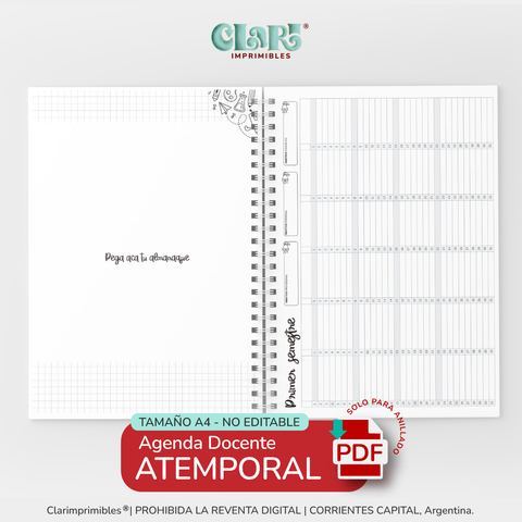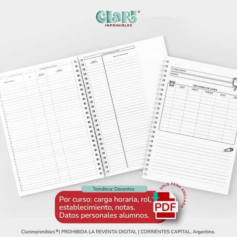 - Ficha de períodos: duración de cada período, para escribir tu itinerario/calendario docente segun la resolución de tu ciudad, para anotar los feriados tanto inamovibles como trasladables y efemérides que tu importancia.