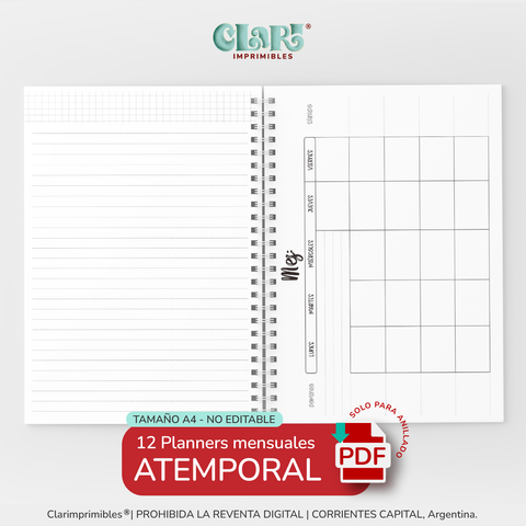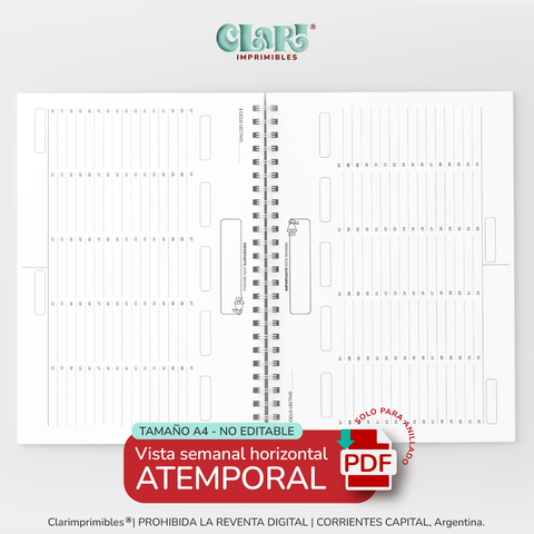 - AGENDA SEMANAL SIN FECHAS que incluye: planner mensual apaisado, planner semanal de lunes a domingo con horarios de 7 a 22 hs, un sector para recordatorio dentro de cada semana y al final de cada mes un registro de gastos y recursos/bibliografias compradas.